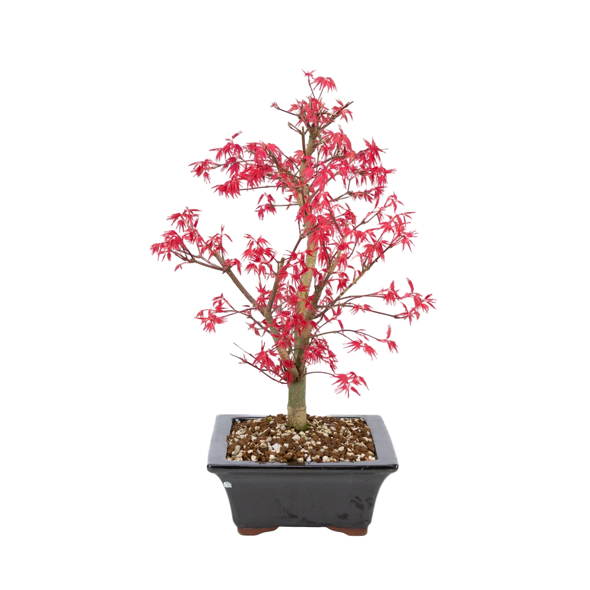 Érable japonais de la variété « Deshojo » aux feuilles rouge vif au printemps. Ce bonsaï est présenté dans un pot rectangulaire noir, dont la couleur s'harmonise parfaitement avec son style moderne.