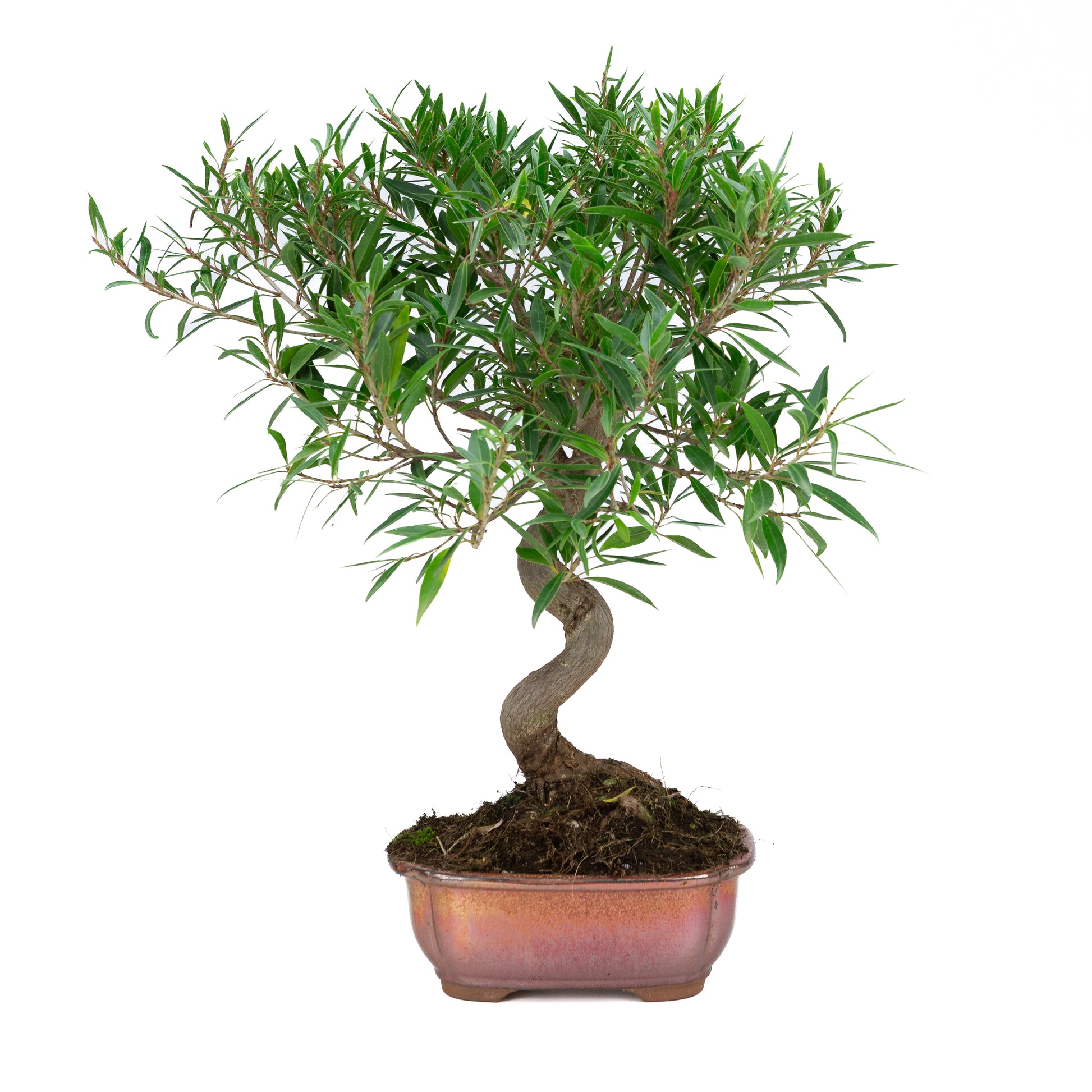 Le figuier à feuilles de saule, caractérisé par des feuilles étroites ressemblant à celles du saule, qui lui confèrent un aspect délicat et aérien. Ce bonsaï est présenté dans un pot rectangulaire émaillé de couleur bronze, aux angles arrondis, qui lui donne un aspect chic.